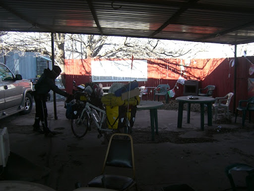 終於在夕陽西下前,到達老闆娘所謂的"Oasis"。她告訴我們有一棟廢屋在路旁,沒窗戶,