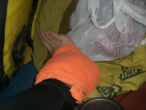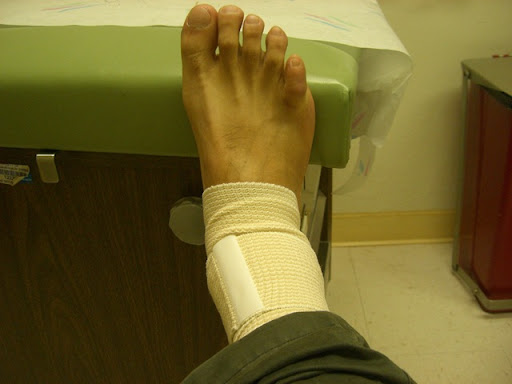 照了X光,骨頭沒事,只是傷到韌帶。打了繃帶固定,開了消炎止痛藥給我。