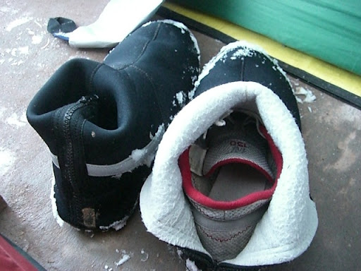 我把以前爬遠征隊的經驗帶進來,這雙雙重靴,外層防水保暖,內層是雙快要磨平的跑鞋