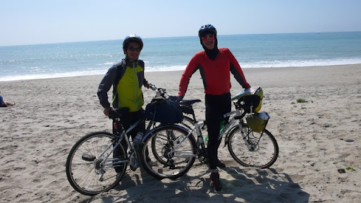 反了),修完後輪,發現前輪的煞車也有問題,總之花了一個小時在海邊修車。